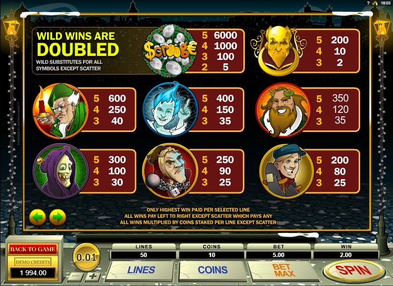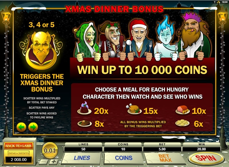 На игровом поле царит рождественская ночь, а веселые огоньки и новогодняя мелодия добавляют настроения. Но начав игру, вам придется встретиться и с негативным персонажем — неприветливым хмурым стариком Скруджем, а также сразу с несколькими призраками. Хорошая новость в том, что все они приносят выигрыши.