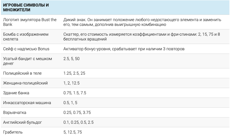 Вам наверняка придется по душе юмористическое оформление слота. Приятная мультипликационная графика, ненавязчивое звуковое сопровождение и динамика игрового процесса настроят вас на желаемый исход раунда. Bust the Bank описание игрового автомата будет неполным без перечисления технических характеристик: