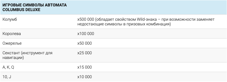 Главным нововведением игрового автомата Колумб Делюкс являются увеличенные выплаты из-за возможности делать более высокие ставки. Причём, если в оригинальной версии игры множители символов были фиксированные, то теперь они изменяются пропорционально выбранному значению взноса. Максимальный коэффициент умножения ставки в обычном Columbus – х5000 за комбинацию из 5 картинок Христофора на любой из 9 линий выплат. При этом общее значение ставки в оригинале достигало 4500 монет. А вот наивысшие значения в deluxe-варианте: