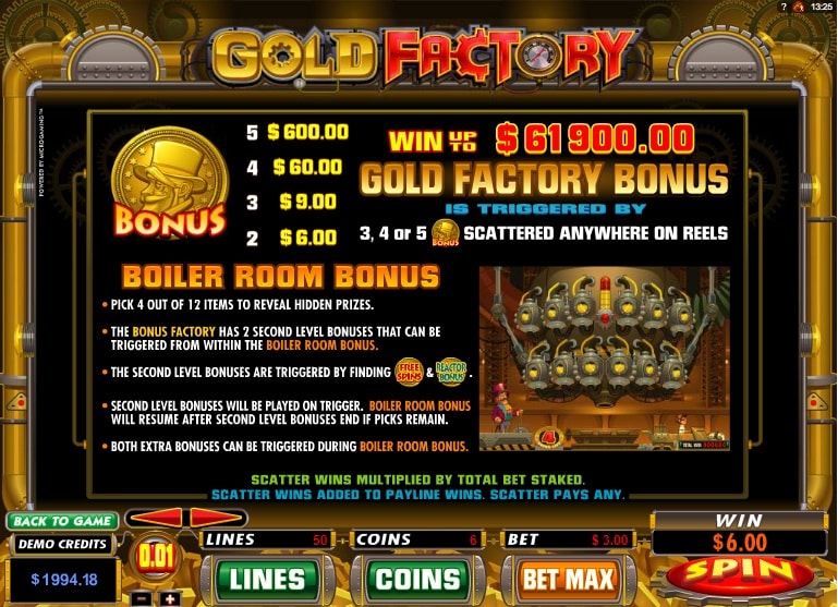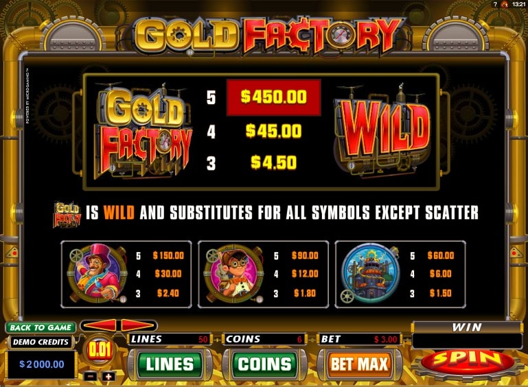 Игровой автомат Gold Factory — это видео-слот от Microgaming, с бесчисленным количеством сверкающего золота, который позволяет добывать полезные ископаемые, направленный на производственную выработку золотых слитков.