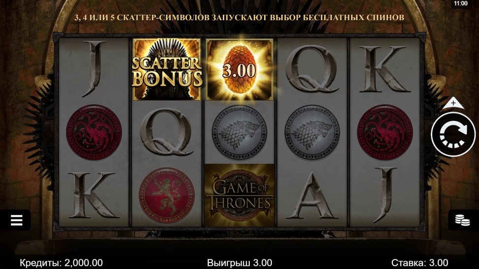 Игровой автомат Game of Thrones — интересная разработка компании Microgaming. В основе аппарата лежит сюжет популярного одноименного сериала производства HBO. Видеослот отличается красивой графикой, а также содержит ряд бонусных особенностей, которые увеличат шансы на выигрыш крупных призов. Для начала рекомендуется изучить правила и особенности игры в бесплатном режиме. Для этого не понадобиться авторизация в казино и пополнение счета. Демо-слот запускается после нажатия соответствующей клавиши, а игра в нем происходит на условные монеты.